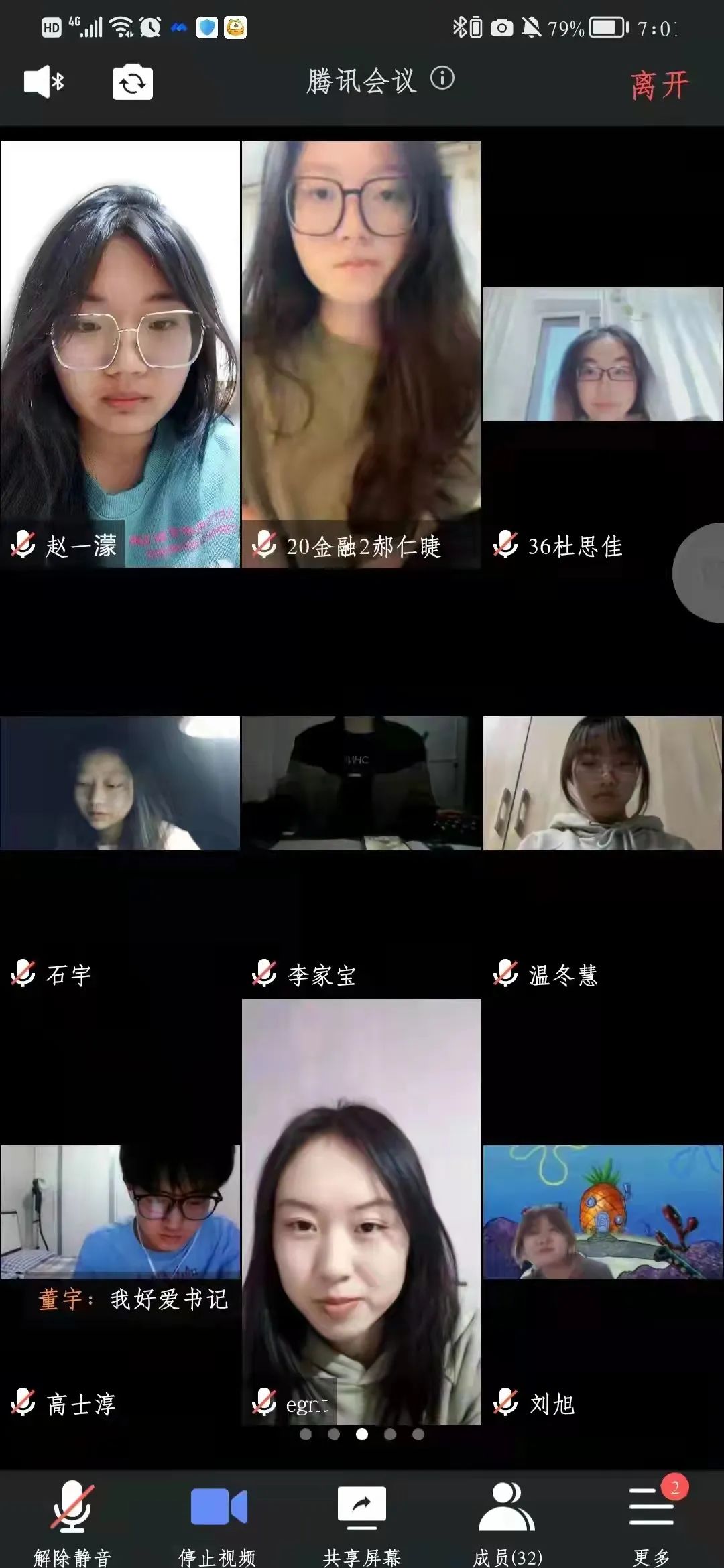3月19日,我院2020级金融学二班于线上开展“喜迎二十大、永远跟党走、奋进新征程”团日活动。本次活动由团支书马宏瑜主持,全体同学积极参加。