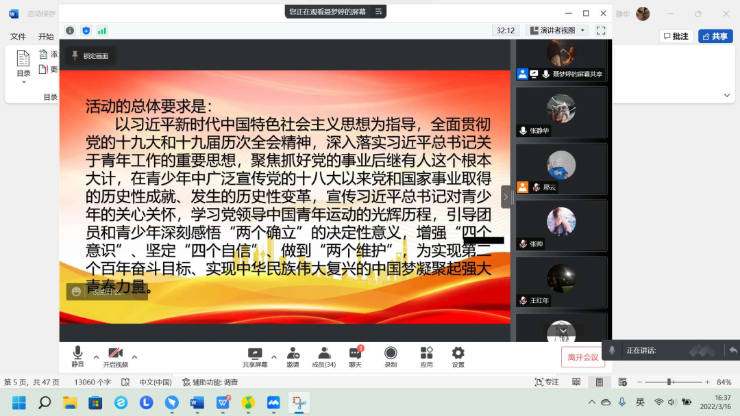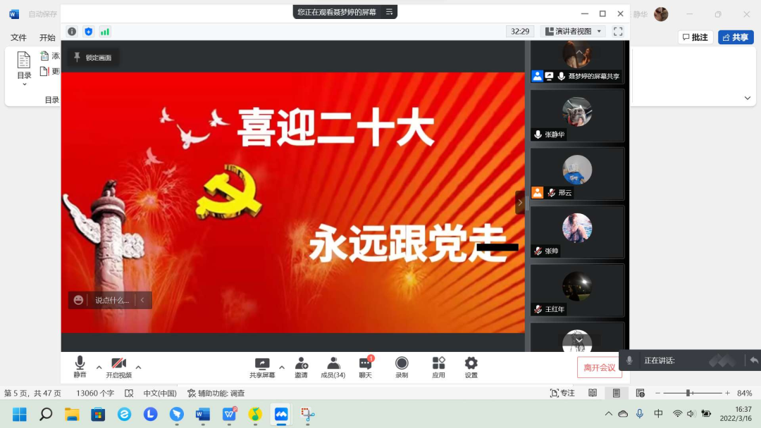 3月16日,我院2021级会计二班于线上开展“喜迎二十大、永远跟党走、奋进新征程”主题团日活动,本次活动由团支书聂梦婷主持,全体同学积极参加。