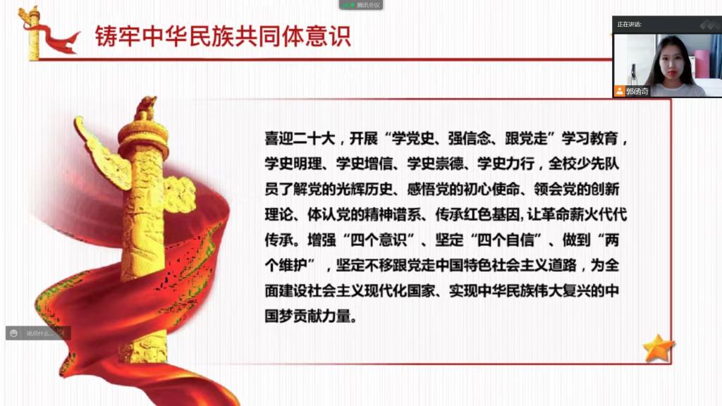 为引导学生深入理解习近平新时代中国特色社会主义思想,扎实推进铸牢中华民族共同体意识教育实践活动,4月13日上午10:00,我院于线上开展“喜迎二十大、永远跟党走、奋进新征程”——铸牢中华民族共同体意识演讲比赛,团委负责人白灵出席本次活动。