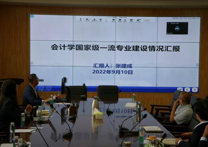张建成副院长就学院会计学专业基本情况;专业培养方案、课程体系、专业方向聚焦;建设目标及目标达成情况;学生就业、历届校友联络情况;存在的问题和不足及下一步工作计划等方面对学院会计学国家级一流专业建设情况进行了汇报。