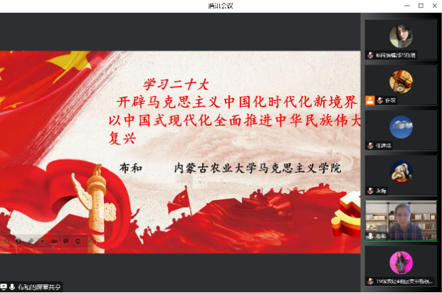 为深入学习宣传贯彻党的二十大精神,切实用党的创新理论武装头脑、指导实践、推动工作,12月8日下午2:30,我院邀请学校师生宣讲团成员、马克思主义学院副教授布和同志于线上作党的二十大精神专题辅导报告,学院党委书记许驭同志主持会议,全体教师、学生代表积极参会。