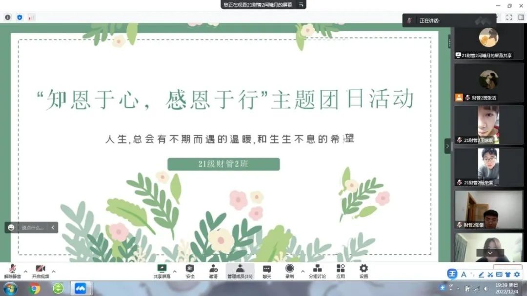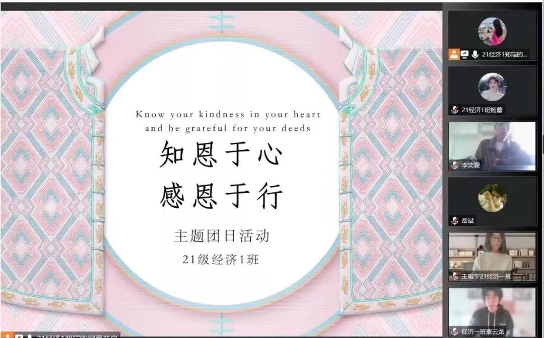为了进一步增强我院学子的知恩感恩意识,引导学生以感恩之心回馈社会,12月4日,我院各团支部于线上开展“知恩于心,感恩于行”主题团日活动,本次活动由团支书主持,全班同学积极参加。