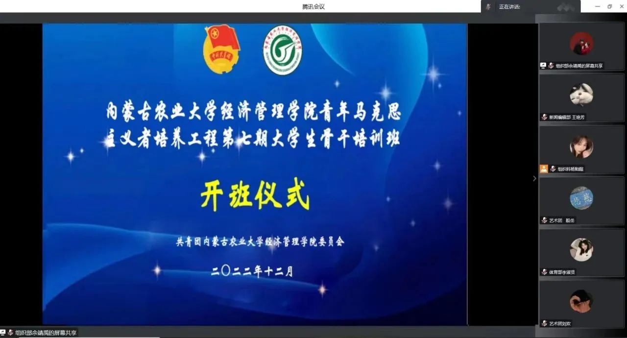 为深入学习贯彻党的二十大精神,切实用党的创新理论武装头脑、指导实践,提高学生干部学习工作能力,近日,我院于线上举行“青年马克思主义者培养工程”第七期大学生骨干培训班开班仪式。本次开班仪式由我院分团委书记白灵主持,我院学办主任徐金鹏、学院组织员苏宁巴乐、学办辅导员李月宇出席仪式,青马班全体学员积极参加。