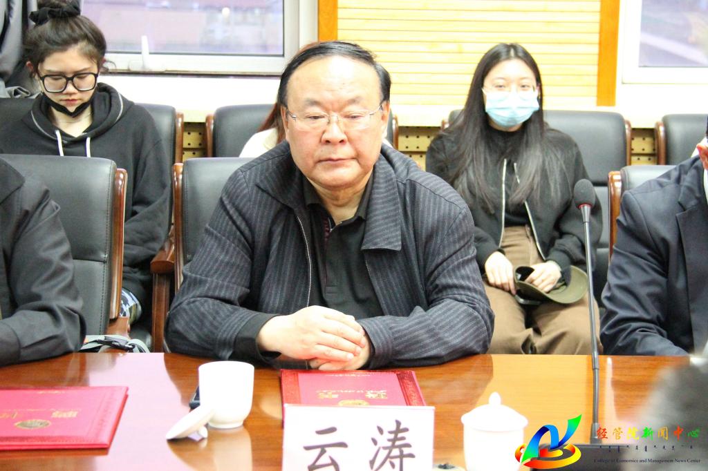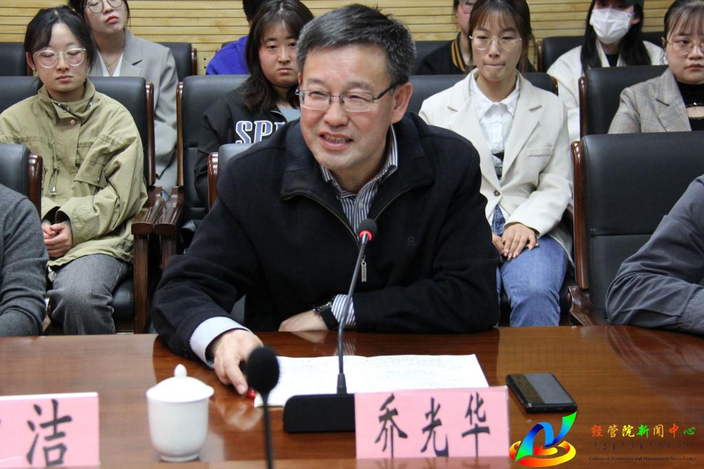 会上,许驭书记宣读特聘导师名单,乔光华院长为特聘导师代表颁发聘书。特聘导师代表赵云平老师以未来规划和落实责任为切点,结合当下研究生职业生涯规划进行分享发言,希望同学们能够利用读研期间做好发展规划及职业去向,结合自身兴趣进行深入钻研,充分利用时间学习真本领,牢记为人民服务、为强国奋斗的使命,真正成长为社会所需要的栋梁之才。2021级科硕代表张晓夏从转变思维方式、分析解决问题、进行有效沟通三方面分享读研感悟及收获,希望同学们开拓学科视野,敢想敢做,在良师益友的陪伴下用坚定的脚步书写经管院科研新篇章。2022级专硕代表姚野苹围绕目标、品行和责任三方面进行分享,呼吁同学们常沐学习之风,开拓进取,勇于创新,在新的起点开创出人生的新境界。会议最后,乔光华院长从教学理念、师资队伍、科研力量三方面介绍我院基本情况,并就学术道德、课程论文、交流沟通和科研实践展开详细讲解,寄语同学们要品行端正、坚守底线、积极向上,充分利用现有资源提高自身综合素质,不断锤炼实际本领。