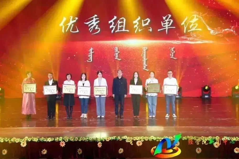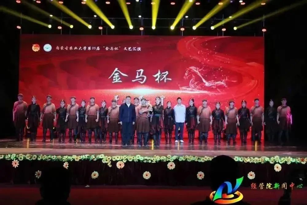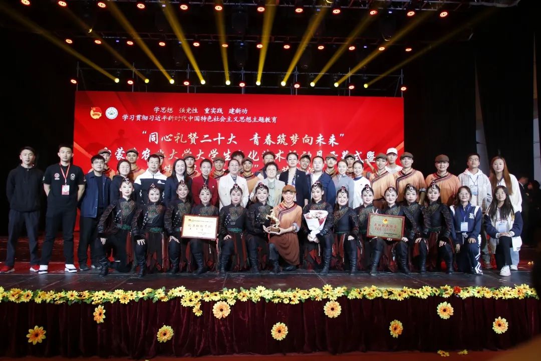 我院选送节目《马铃摇响幸福歌》(学演),以“蒙古马精神”为主题立意,将传统民族舞蹈与走马竞技文化相结合,通过浑厚豪迈的舞蹈体现了马的性格、风度、风采及韵味,向观众展现了草原儿女在党的光辉照耀下守望相助、团结奋斗、一往无前的品格和精神。百年灯火,草原儿女赤心照山河;万里春色,牧野山川碧草映霞光。金络青骢,苍穹浩茫,蒙古马精神深深镌刻在草原儿女的灵魂深处,人与蒙马守望相助心向党,奋发逐梦新征程。表演者们风姿绰约,以曼妙的舞姿定格了一个个精彩的瞬间,或刚劲有力、挺拔豪迈,或优雅柔美、婀娜多姿,鼓声激昂、乐声悠扬、扣人心弦,激昂的青春热血被挥洒得淋漓尽致。最终,我院凭借优异的表现以99.120分的成绩捧得金马杯,并获得优秀组织单位奖。