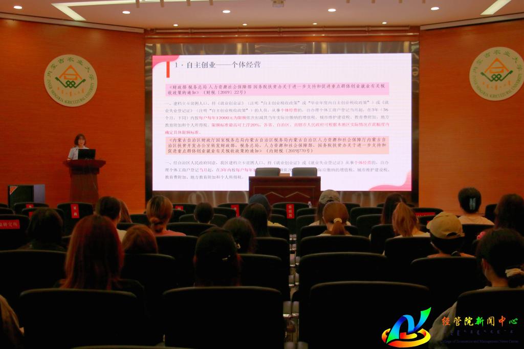 活动第二项,开展大学生创业税收政策宣传讲座,赛罕区税务局工作人员赖欣琪女士主讲,高年级学生参加专题讲座。赖欣琪女士围绕自主创业中的个体经营和小型微利企业及继续教育支出的优惠内容和政策依据进行详细解读,鼓励同学们打破固有就业方式,引导毕业生自主创业,以创业带动就业。