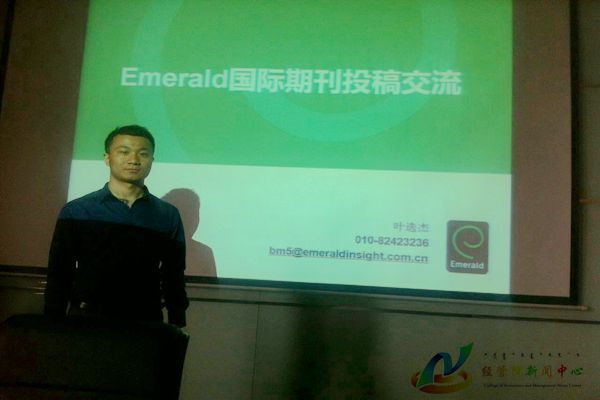 4月14日下午4:00,在校图书馆的大力支持下,经管院邀请Emerald北京代表处客户经理叶选杰先生在五楼会议室开设了Emerald国际期刊投稿交流讲座。本次讲座旨在更好地满足教师对专业文献资源的多样化需求,更好地促进和推动学术研究。我院党委书记赵国年,院长乔光华,副院长宝音都仍等多位教授、老师参加讲座。