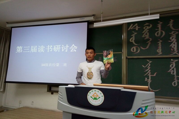 4月26日晚7:00,经管院2014级农经蒙2班在南教202举办第三届读书研讨会。蒙汉双教研室的杜富林老师、原英老师、2014级年级主任苏宁巴乐以及班主任乌云花出席了本次研讨会。