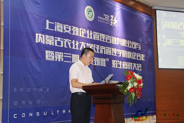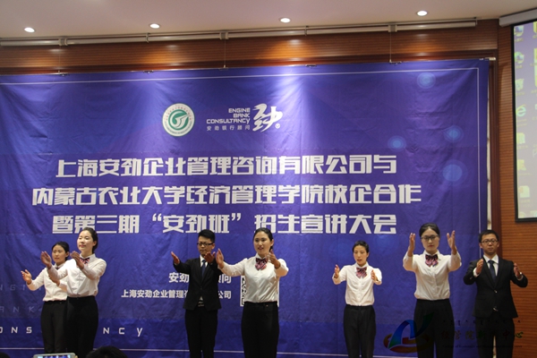 为加强响应我校“两提高,一降低”的中心工作,充分提高学生就业竞争力,发挥校企合作优势,培养高素质高技能的应用型、创新型人才。6月21日晚7:30,经管院在学院123报告厅开展“安劲班”第三期学员招募宣讲会,我院院长乔光华、副院长宝音都仍,上海安劲企业管理咨询有限公司董事长王子义,总经理王子成,人力资源部经理张丽清,安劲班项目负责人杨丽以及特邀嘉宾钮子乔出席此次活动。来自内蒙古金融网、内蒙古晨报的记者朋友,与我院近三百名同学参加了本次大会,活动由我院党委副书记王智广老师主持。