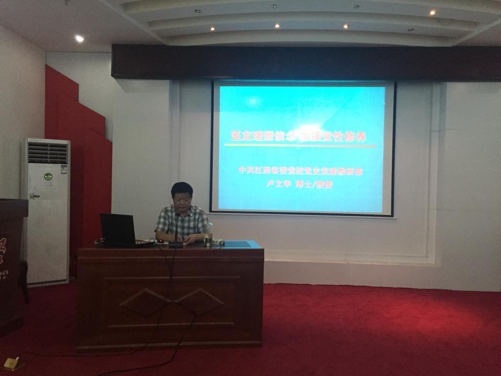 现场教学之后,江西省委党校党史党建教研部的卢文华教授做了《坚定理想信念,加强党性修养》的专题报告。卢教授从理想信念的概念释义、范畴关系、共产党人的理想信念、共产党人理想新的作用及其与党性修养的关系等几个方面进行了阐述。他强调,我们应该从革命先烈对理想信念的坚守中获得启示,加强党性修养,认真学习和遵守党章,构筑拒腐防变的思想长城,做政治上的明白人。