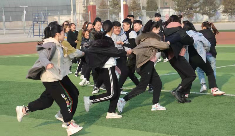 本次素质拓展共分为八个项目——海豚戏珠、摸石头过河接力跑、头贴尾、夹球接力跑、大丰收、扳棍、50×6、呼啦圈游戏。伴随着悠扬曼妙的音乐,户外拓展活动正式拉开帷幕。在负责人有条不紊的指挥下,2020级新生以班级为单位依次开展素质拓展活动。和煦的阳光撒在跑道上,夹球接力跑的同学们摩拳擦掌,跃跃欲试。在另一边,海豚戏珠游戏正在火热进行中,一投一接、一发一送,球在空中飞扬……丰富有趣的小游戏极大地考验了同学们的身体协调能力和灵活性,同学们在团体游戏中进一步加强团队合作意识。活动在欢声笑语中接近尾声,最终所有班级圆满完成各项拓展项目,分享喜悦与激情。